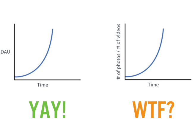 “The ratio of photos to videos uploaded per person” is not clearly valuable (why does this ratio matter?), sensitive (the ratio may not change a lot unless you fundamentally change your product in a big way), and is not simple (is the above shape good? is it going up because people are uploading more photos or the video upload flow is broken? what would you expect to be a “good shape” to that curve?)